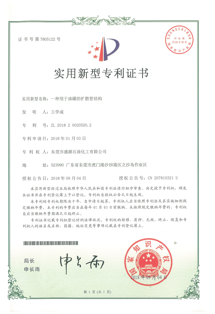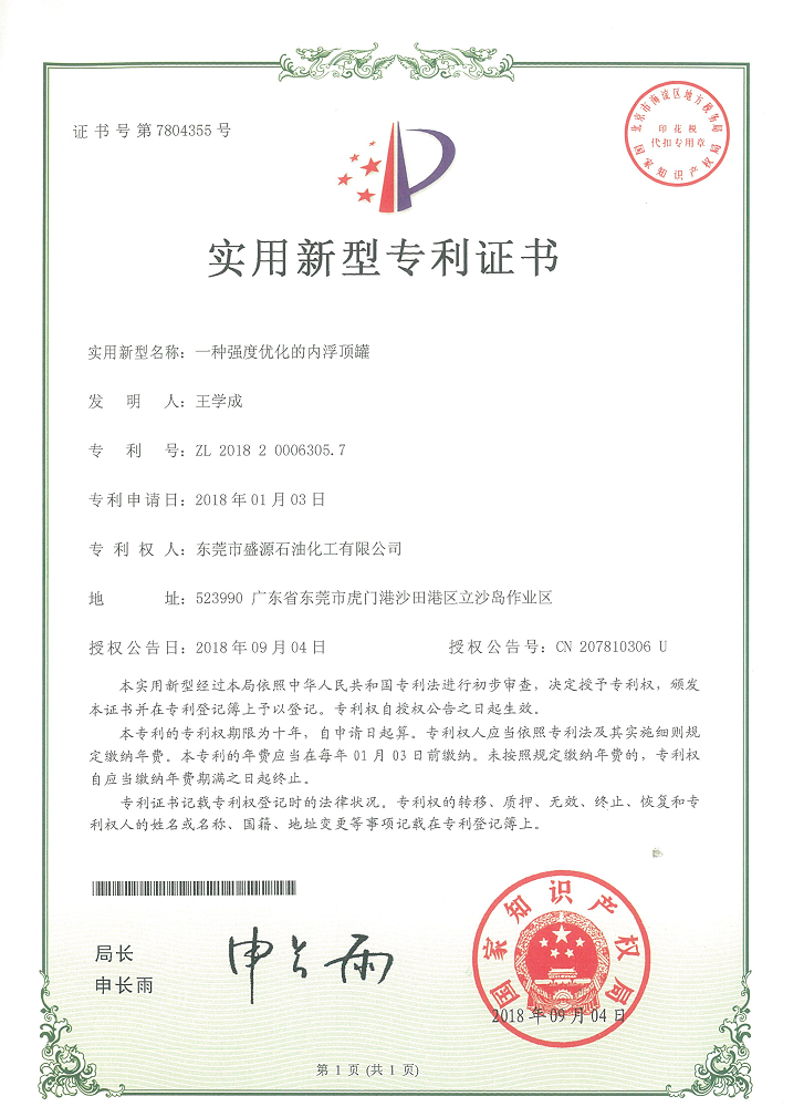 實(shí)用新型內(nèi)浮儲(chǔ)罐專(zhuān)利證書(shū)Click for larger image