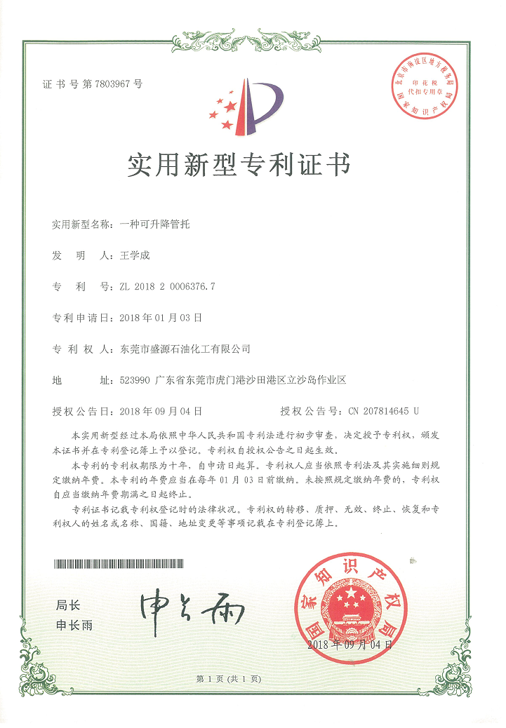 實(shí)用新型升降管托專(zhuān)利證書(shū)Click for larger image