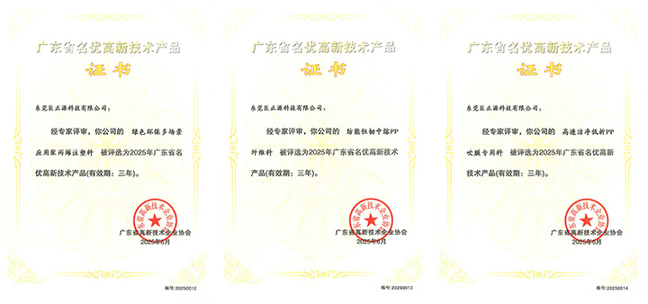 近日,廣東省高新技術(shù)企業(yè)協(xié)會公布了2025年第一批廣東省名優(yōu)高新技術(shù)產(chǎn)品名單。東莞巨正源科技有限公司的“綠色環(huán)保多場景應(yīng)用聚丙烯注塑料”、“紡能恒韌中熔PP纖維料”、“高透潔凈低析PP吹膜專用料”三項(xiàng)產(chǎn)品憑借卓越的產(chǎn)品品質(zhì)、創(chuàng)新的產(chǎn)品技術(shù)和領(lǐng)先的市場地位,榮獲“廣東省名優(yōu)高新技術(shù)產(chǎn)品”稱號。