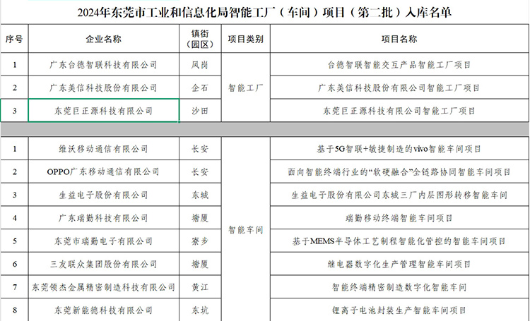 7月1日,東莞市工業(yè)和信息化局公布了2024年東莞市工業(yè)和信息化局智能工廠(車間)項目(第二批)入庫名單。東莞巨正源科技有限公司憑借在數(shù)字化轉(zhuǎn)型和智能制造領域的創(chuàng)新實踐與顯著成效,獲評為“東莞市智能工廠”。