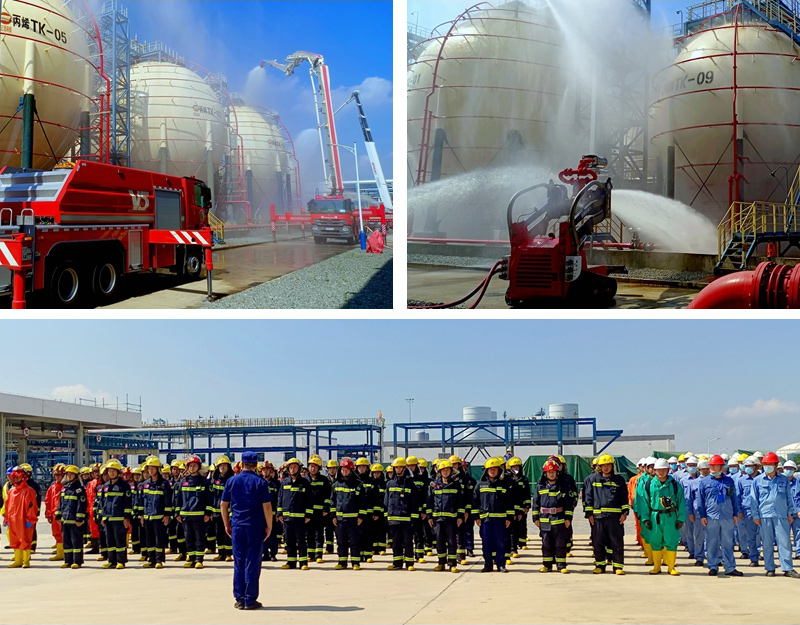 演練模擬設定在上午9時,巨正源科技公司碳四TK-09號球罐罐底排余管道法蘭墊破損,造成大量丁烷、異丁烷泄漏,沉積在球罐底部區域,由于靜電作用發生爆燃,碳四TK-09號球罐泄漏點不可控燃燒,情況十分危急。巨正源科技公司立即啟動應急預案,公司領導趕往事故現場,指揮應急小組迅速開展應急處置。東莞市消防救援支隊指揮中心接到報警后,立即調派濱海灣新區、沙田及周邊鎮區大隊共20車90名指戰員趕赴現場處置,投用了遙控消防機器人、遠程供水車、舉高噴射消防車等裝備開展應急處置。同時,濱海灣新區大隊接警值班室通知立沙島島上企業消防隊力量、各應急聯動部門到場協助處置。